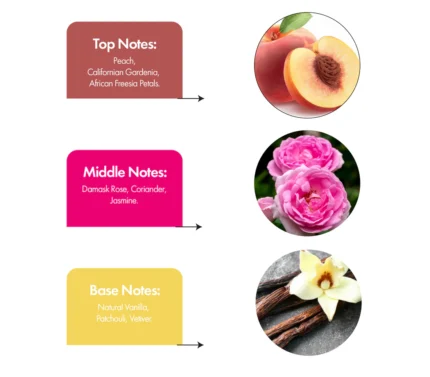 Notes: Peach, California Gardenia, African Freesia Petals, Coriander, Damask Rose, Jasmine, Patchouli, Natural Vanilla, Vetiver
