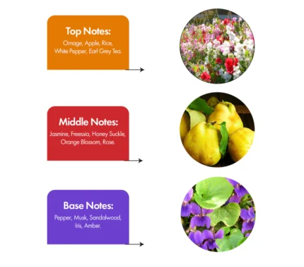Notes: Top: Pear, Melon, Magnolia, Peach, Mandarin Orange, Bergamot; Middle: Jasmine, Lily-of-the-Valley, Tuberose, Freesia, Rose, Orchid, Plum, Violet; Base: Musk, Vanilla, Blackberry, Cedar